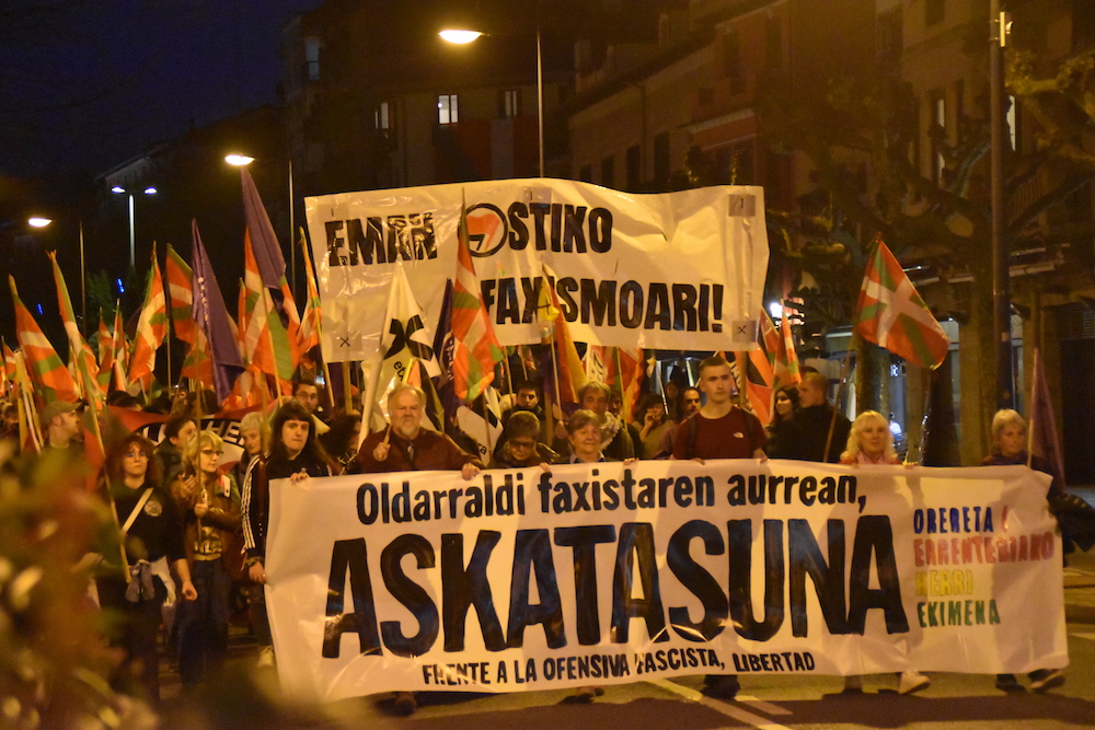 Iñaki Iglesiasek euskaraz eta Ageda Blascok gaztelaniaz irakurri dute manifestazio bukaerako agiria. Herritarrek aurrera pausua eman dutela gaur internazional erreakzionarioaren aurrean esan du hizlariak, “horien agendaren eraginez, eskuineranzko desplazamendua ematen ari da mundu mailan”. Euskal Herria ez dela burbuila eta munduan gertatzen ari denak bertan eragina izan baduela nabarmen jarri du, “eta gaur gaurkoz gure herrian eskuin muturraren hazkundea antolatua eta egituratua denik esan ezin daiteke; eragite ahalmena marjinala da. Baina horrek ez du esan nahi Euskal Herrian joera erreakzionarioak sumatzen ez direnik”. Hori horrela, adi egoteko deia bertan ere balioa atzerakoiak zabaltzen ari diren zalantzarik ez dutelako gaurko protestaren deitzaileek, “arlo guzietan ez bada ere, gai batzuetan eskuin muturraren mezuak euskal jendartean barneratzen ari direlako”.