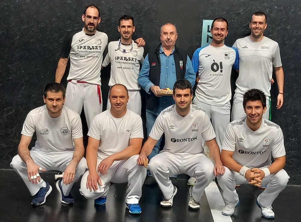 Zutik: Urreaga, Arregi, Toledo epailea, Polaina eta Larretxea. Makurtuta: Arbelaitz, Aritzmendi, Etxeberria, Zabala. Pasa den asteburuan Euskal Herriko pala txapelketako beste zortzi kanporaketa jokatu zituzten; tartean bi bikote oiartzuar aritu ziren. Markos eta Bereziartuak osatutako bikoteak 25 – 15 irabazi zioten Iraola eta Gonzalez tolosarrei, eta finalerdietarako sailkatu dira. Bestetik, Arizmendi eta Arbelaitzek 17 – 25 galdu zuten Zabala eta Etxeberriaren aurka, eta txapelketatik kanpo geratu dira.