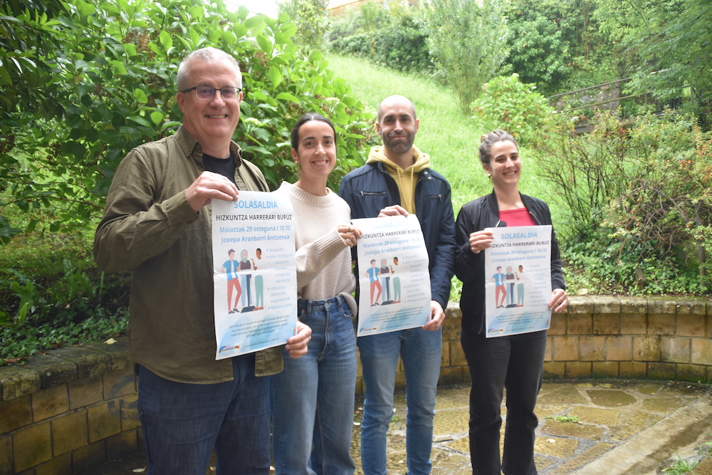 Lau Hazietara Euskaltzaleon Topaguneko zenbait kide, solasaldiaren afixarekin. Bi urteko gogoeta prozesua egin du Lau Hazietara Euskaltzaleon Topaguneak hizkuntz harreraren gainean, eta txikitik handira egindako proposamenarekin dator orain: hizkuntza harreraren gaineko solasaldia antolatu du datorren ostegunerako, hilak 29, 18:30ean Joxepa Antoni Aranberri anitzenearen hirugarren solairuan. Etorri berriak diren bizilagunei, zein bertan bizita ere euskara urrun duten horiei euskara eta euskararen mundura hurbiltzeko saioa izango da, harreragileengan edo gauza bera dena, euskal hiztunongan eraginda. Izan ere, horiei begirakoa da larunbateko solasaldiaren lehen atala; bigarrenean, harrera jaso duten eta euskarara gerturatu diren zenbaitek parte hartuko dute.