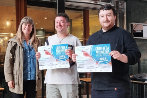Errenteriako kasuan, Jokin Pedreñok jaso du saria, eta Bixigarri jatetxean egingo du otordua. Irudian, Leire Mazizior Hizkuntza berdintasuneko zinegotzia, Jokin Pedreño eta Bixigarriko Imanol Lasa.