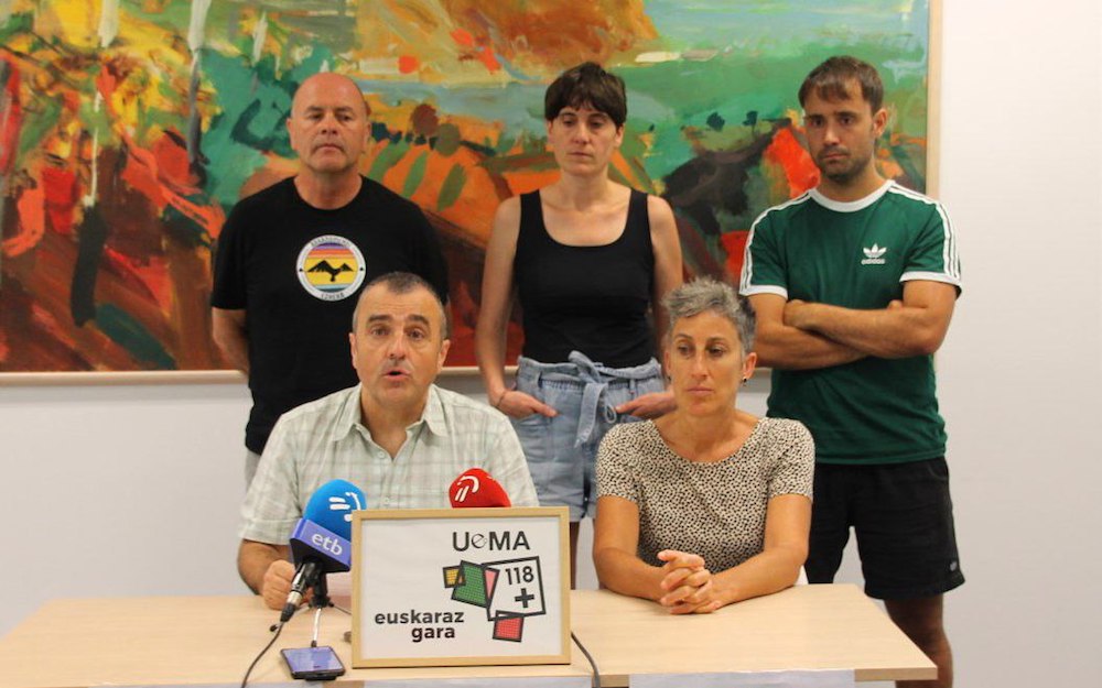 Mahaian, Martin Aramendi UEMAko lehendakaria eta Irune Urbieta lehendakariordea. Atzean, zuzendaritza batzordeko beste hiru kide. UEMA “Euskara bigarren mailako hizkuntza izatera kondenatu dute, beste behin ere“. Horrela hasi du Udalerri Euskaldunen Mankomunitateak (UEMA) gaur egin duen agerraldia. Martin Aramendi UEMAko lehendakariak izan du hitza, eta jakinarazi du Euskararekin bat lelopean UEMAko kide diren herrietako udaletxeen aurrean elkarretaratzeak egingo dituztela larunbatean (hilak 19), 12:00etan, eta euskalgintzako eragileak eta herritarrak deitu dituzte deialdiarekin bat egitera.
