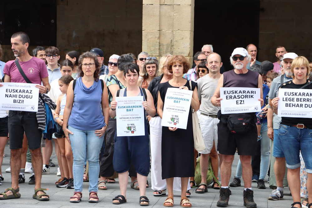 Euskararen alde egiteko, eta Espainiako Auzitegi Gorenaren azken erabakia errefusatzeko bete egin da gaur eguerdian Done Eztebe plaza. Ardura, kezka eta amorru aurpegiak udaletxearen parean. Udalerri Euskaldunen Mankomunitateak (UEMA) elkarretaratzera deitu ditu herritarrak gaurko, euskara bigarren maiakoa izatea ahalbidetu dezakeen sententzia horri aurre egiteko. Plaza bete dute, ahots isilekin.