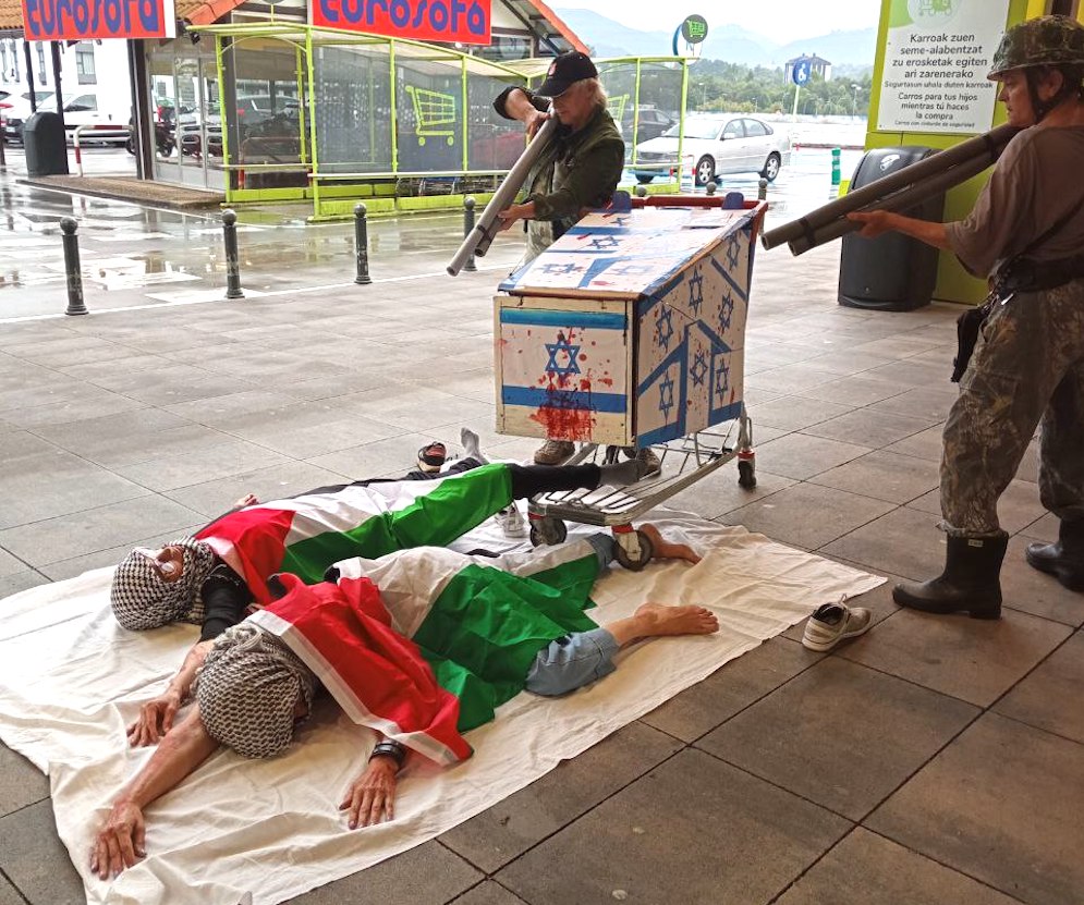 Emakume Askeak taldeak, abiatu berri duen kanpainaren barruan, performance bat egin zuen atzo Oiartzungo Carrefour supermerkatuaren kanpoaldean. Taldeko kide batzuk militarrez jantzi (Israelen bandera zeramaten karroen alboan) eta bi palestinarri tiro egiten ari zirela irudikatu zuten, israeldar produktuen eta Israeli laguntza ematen dioten edozein enpresaren kontrako boikota eskatuz supermerkatura sartzen ari ziren guztiei.