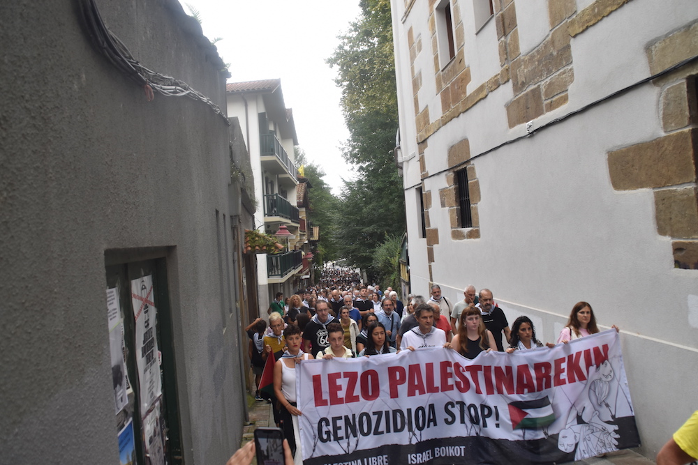 Handia. Oso handia. Ziurrenik Lezon egin den manifestazio handiena izan da arratsaldekoa. Isila. Bidea zabaltzen Gernika-Palestina Herri Ekimenak sortutako olerkiak. Plaza, Kale Nagusia, Jaizkibel hiribidea eta Zubitxo kalea estuegi gelditu dira zapi palestinardun sorbaldez betetako martxari bide emateko. Behin plazan, jende multzoak adi-adi entzun ditu hizlarien mezuak. Bafleetatik hitz jarioa eten denean, txalo zaparrada luzea. Agian, Gazan ere entzun dute eskuen talkaren hotsaren zarata. Lezo Palestinarekin, genozidioa stop! izan da gaurko martxaren leloa.