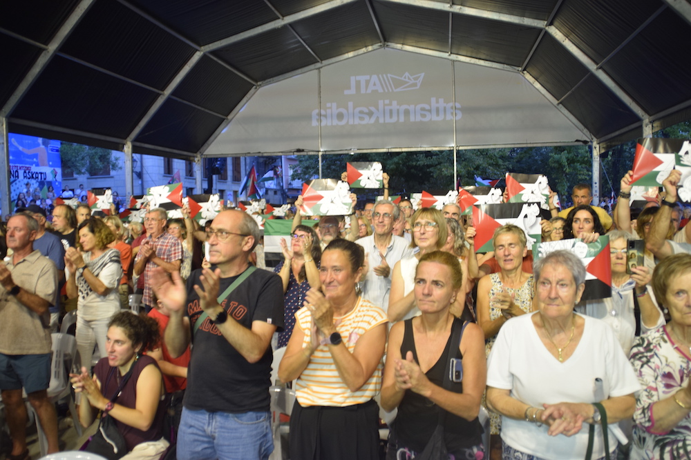 PAlestinaren aldeko mezua atzo Atlantikaldian. Kultura eta musika elkartasun hauspo bilakatu ziren atzo. Atlantikaldiaren Itsasargi nagusiaren agertokia estreinatu zuen jaialdiaren hamabigarren ekitaldian Sol Band musika talde palestinarrak. Musika emanaldi bikaina, goi mailakoa, eskaini zuten Gaza iparraldean sortutako taldeko artistek. Bertaratutako ikusleek txalo artean, Palestina askatu oihuekin, eta Palestinako banderak eskutan zituztela hartu zituzten.