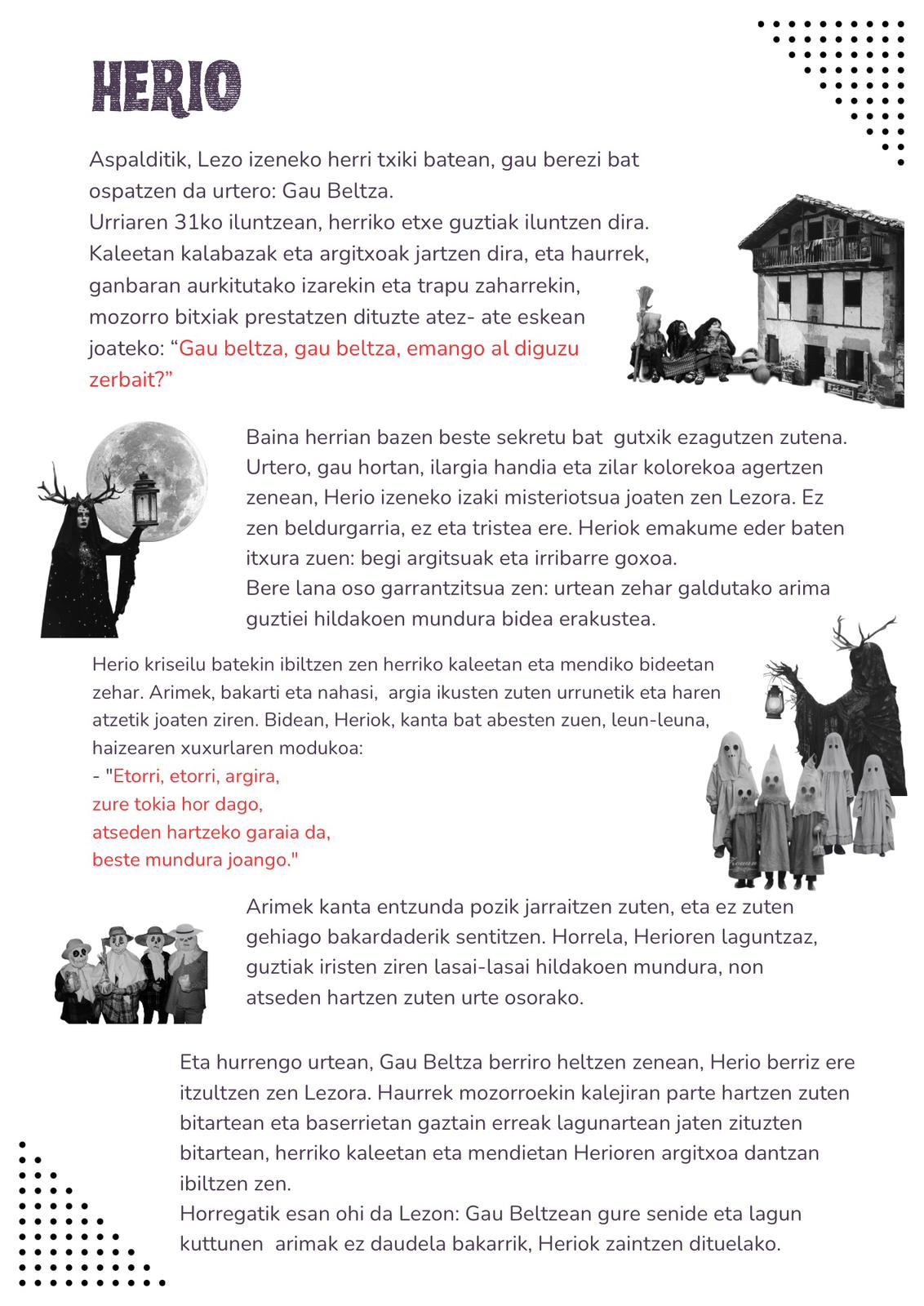 “Aspalditik, Lezo izeneko herri txiki batean, gau berezi bat ospatzen da urtero: Gau Beltza”. Hala hasten da Herioren kondaira, Gau Beltzean, ilargia handia eta zilar kolorekoa den horretan, agertzen den pertsonaiaren kondaira alegia. “Heriok emakume eder baten itxura zuen: begi argitsuak eta irribarre goxoa. Bere lana oso garrantzitsua zen: urtean zehar galdutako arima guztiei hildakoen mundura bidea erakustea”.