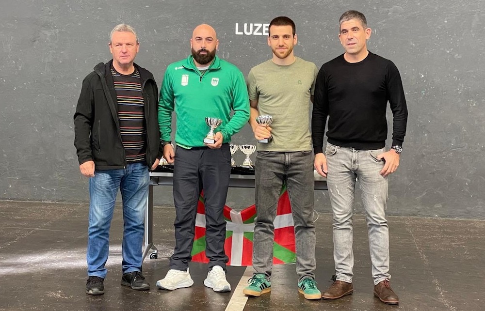Etxezarreta eta Yorel sari banaketan.EPLE Aurkia eta ifrentzua asteburuan EPLErentzat, txanponaren bi aldeak. Eskuz Binakako Lehen Mailako finalerdietan Santxo eta Arangurenen garaipena eta finala jokatzeko txartela; Larruzko Palestako Bigarren Mailako finalean, baina ez zuten irabazterik lortu Etxezarreta eta Yorelek.