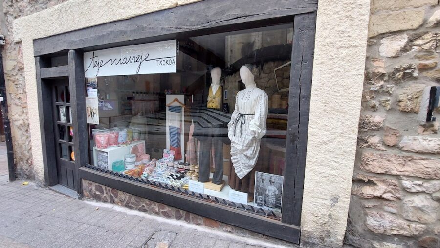 Herrian oihalak eta artilea saldu, eta ikastaroak eskaintzen dituzten lau denden erakusleihoetan baserritar jantziak jarri ditu Iraultza Dantza Taldeak-Jantziaren Zentroak.