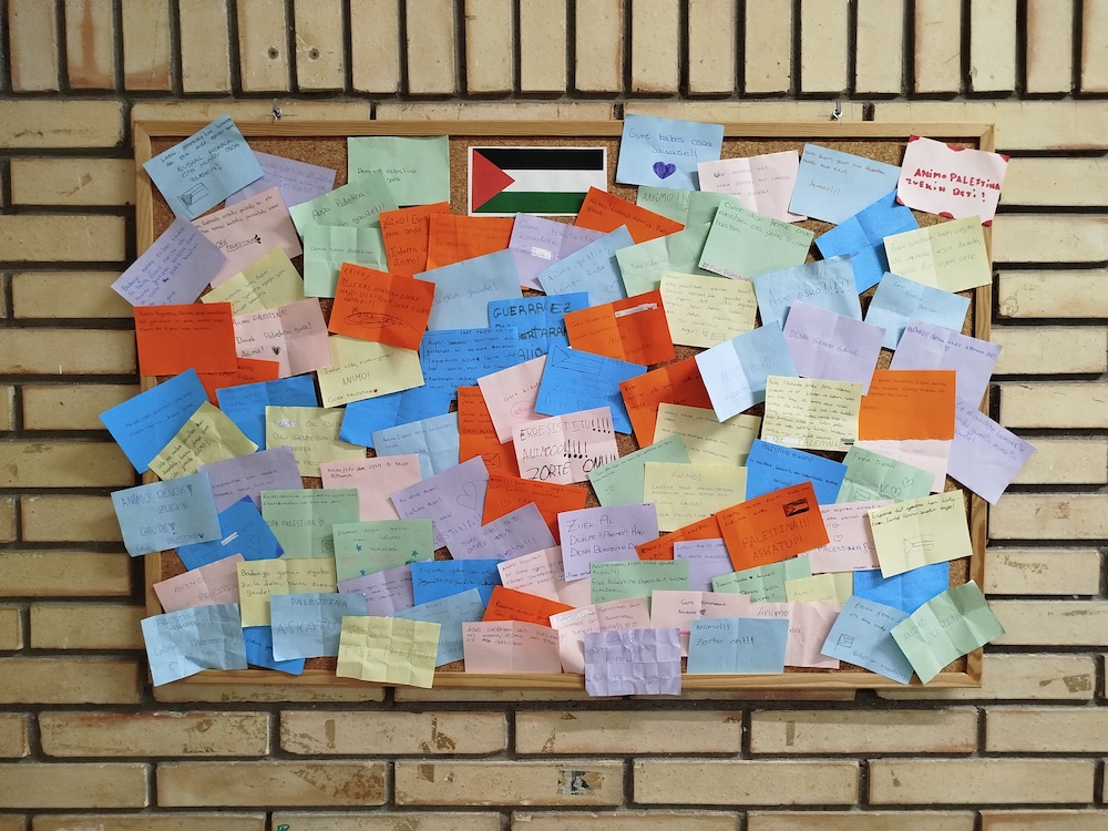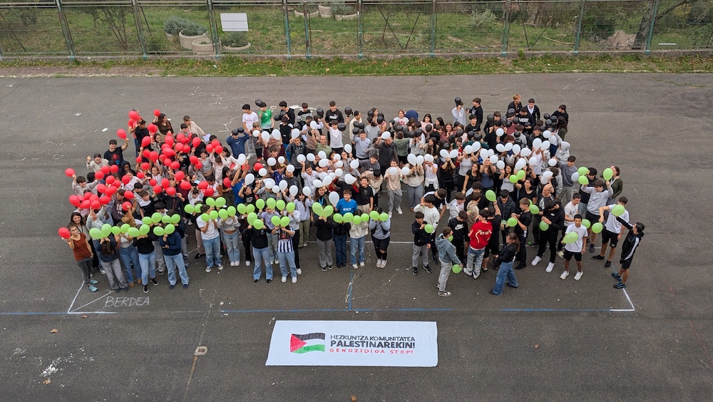 Globoetan sartu dituzte muralean ezarritako animo, bake eta elkartasun mezuak. Zerura bidali dituzte globoak, Palestinaraino iristeko. “Keinu sinboliko honen bidez, Gazan milaka haurrek bizi duten egoera gogorarazi eta euren babesa adierazi nahi izan diete”, esan dute institututik.