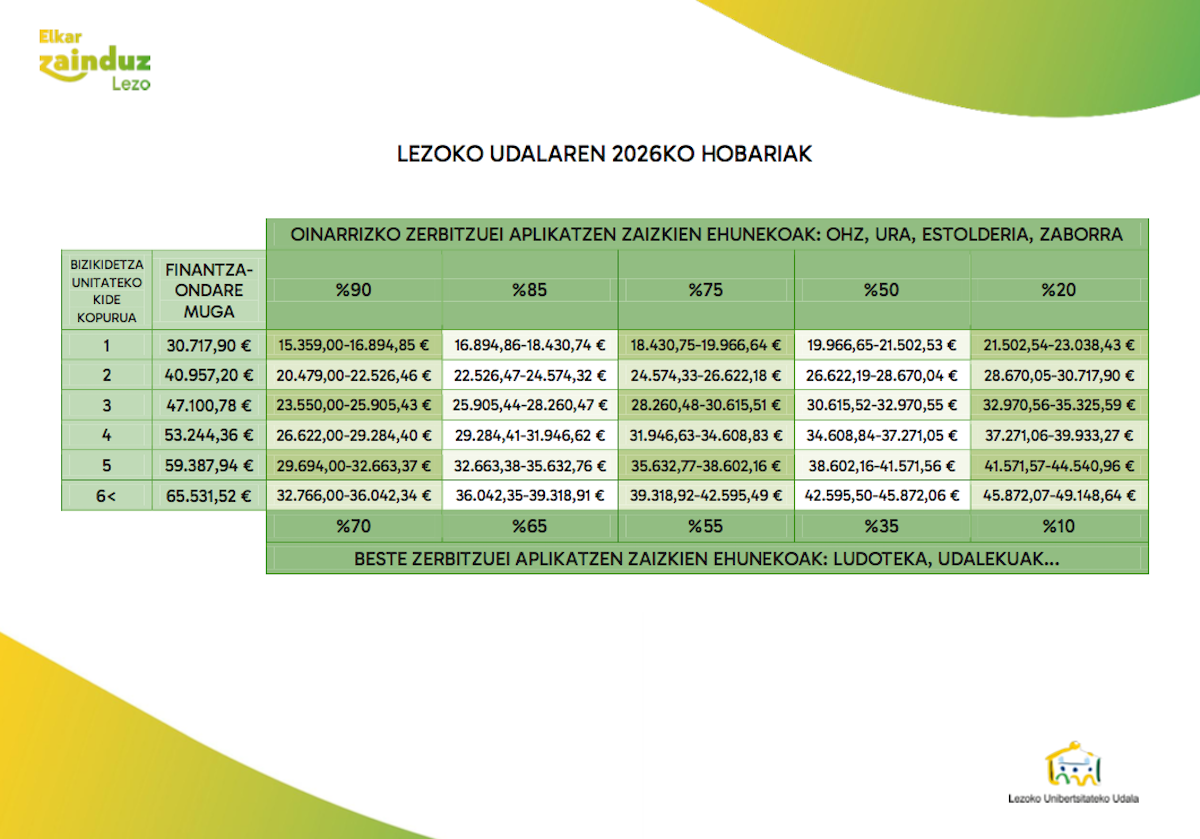 Hobarien sisteman den zergen artean urarena dago. 2026ko udal zerga eta tasetan hobariak eskatzeko aukera dute lezoarrek, otsailaren 28ra arte. Lezoko Udalak familien errenta mailaren araberako hobari sistema du: “Helburua da familia edo pertsonak bakoitzak, bere diru ondarearen mailaren arabera zergak proportzionalki ordaintzea, horrela, baliabide gutxiago dituztenentzat hobariak eskainiz”. Hobari horien taula albiste honen behealdean ikus daiteke.