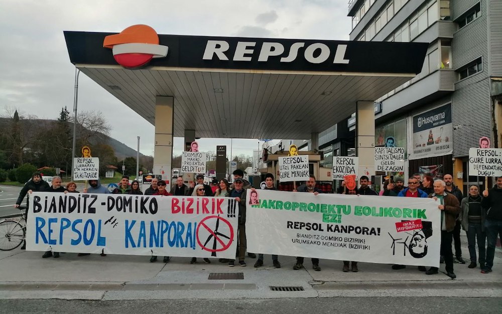 Era berean, nabarmendu dute erregai fosilen negozioan sakontzen duen bitartean, “multinazional bera Artikutza, Arano, Goizueta, Hernani, Lesaka eta Oiartzun inguruko mendiak txikituaz kapitala metatzen jarraitu nahi duena, oraingoan 200 metroko altuerako haize errotez osatutako makro zentral eolikoak jarriaz”.