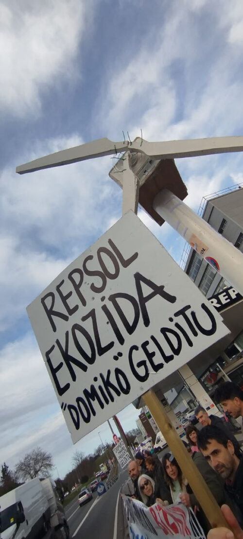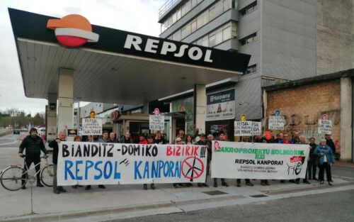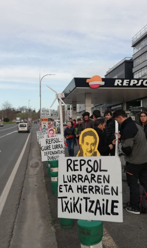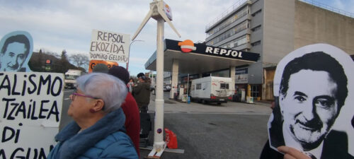 Bianditz Domiko eta Urumeako Mendiak Bizirik taldeek deituta, “Repsolen praktika ekozida eta kolonialak salatzeko” elkarretaratzea egin zuten atzo arratsaldean Lintzirinen.