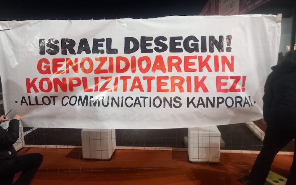 Bertaratu ziren herritarrek galeriaren barrutik zein bulegoaren atarian Palestinaren aldeko leloak oihukatu, Israelen genozidioa salatu eta Allot enpresaren berri eman zuten esku orriak banatuta.