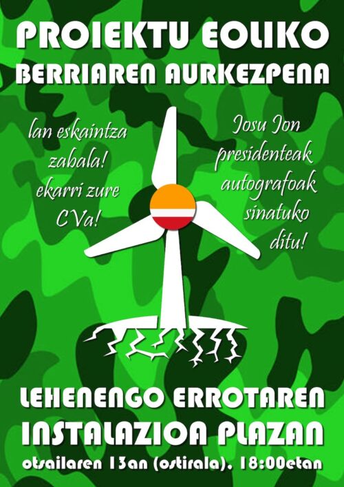 Proiektu eoliko berriaren aurkezpena egingo dutela aurreratu dute, eta baita “lan eskaintza zabala” egongo dela ere. Gauzak horrela, CVa eramateko deia egin dute, eta, horretaz gain, Josu Jon presidenteak autografoak sinatuko dituela ere gaineratu dute.