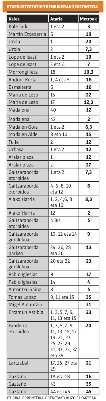 Informazio gehiago bildu dute auzo elkarteek, eta Topoak bere ibilbidean etxebizitzak zein distantziara dituen jaso dute, auzoz auzo, kalez kale (ondoko koadroan datuak); gertuen dauden etxebizitzak trenbidea bi metrora dute, hirura, laura… ondo-ondoan. Hori horrela, auzo elkarteek Erdialderako topoarentzat duten proposamena azaldu zuten: lurperatzea. Batzarrera bildutako bizilagunek txaloekin hartu zuten proposamen hori: «Inongo unetan ez ziguten ezetz biribilik erantzun, ulertu zuten esan geniena. Araba, Bizkai eta Gipuzkoan milioika eurotako inbertsioak egin izan dituzte geltokiak eta trenbideak lurperatzeko, eta gure herriak ere merezi du». Aurreko bileran esan zuten, eta joan den astekoan errepikatu: «Ez gara bigarren mailakoak».
