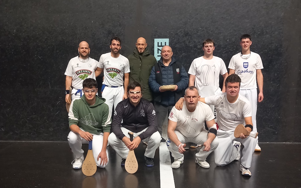Zutik, Xalbador I, Xalbador II, I.Bergara (antolatzailea)A.Toledo ( epailea). Urbieta eta Alberdi. Makurtuta, Bergara, Flores, Diaz eta Zelaia. Girizia elkarteko pilota sailak berrogeita bigarrenez antolatu du aurten Euskal Herriko pala txapelketa irekia, eta larunbatean jokatu zituzten lehen partidak Madalensoron.