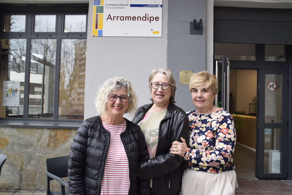 Alegria, Llorente eta Vizcaino Arramendipe elkartearen aurrean. Duela urtebete hartu zuten Pontikako Arramendipe jubilatuen elkartearen ardura Yolanda Llorentek, Celes Vizcainok eta Maria Jesus Alegrek. Idazkaria, presidentea eta diruzaina dira hurrenez hurren. Laugarren emakume bat ari da hauekin hasieratik lanean, Magdalena Piñeiro —gaixo dagoelako ez zen elkarrizketan izan—. Llorente eta Piñeiro auzokoak dira; Vizcaino eta Alegre ez, baina bertara joaten ziren aurretik gimnasia egitera. Pandemiarekin batera gainbehera hasi zuen erretiratuen elkarteak, taberna itxi behar izan zuten, eta horrekin batera, inoiz izan dituen 300 bazkidetik gorako asko-askok baja eman zuten, «50 izatera heldu ginen», azaldu dute hiru emakumeek. Tabernarik gabe urteetan, gutxi ziren bazkide egitera animatzen ziren 60 urtetik gorako bizilagunak, hori baita bazkide izateko baldintza kuota ordaintzearekin batera, eta iaz elkartearen gaineko erabaki bat hartzeko batzarra egin zuten auzoan.
