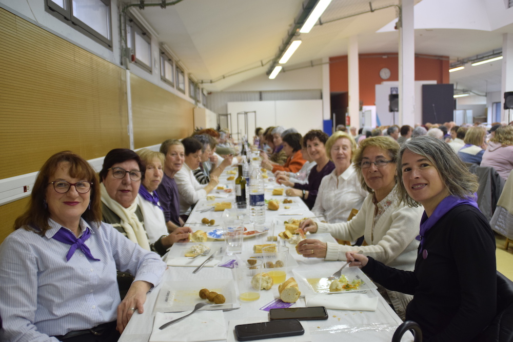 350 emakume bildu dira mahaiaren bueltara auzoetako emakume elkarteek antolatutako bazkarian. Merkatuzarren aldarrikapenak eta festak egin dute bat, aurten ere.