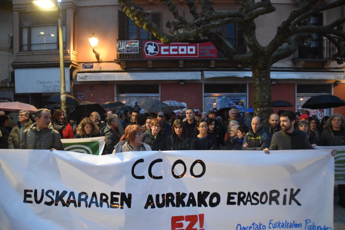 Dozenaka lagun elkarretaratu dira euskararen kontrako oldarraldia salatzeko. Dozenaka eta dozenaka lagun atera dira kalera gaur arratsean euskara babestera, hauspoa ematera, hura erasotzen ari direnei aurre egitera. Oreretako Euskaltzaleon Pizkundeak deituta 400 lagun inguru elkarretaratu dira CCOO sindikatuak Errenteria-Oreretan duen egoitzaren aurrean. Izan ere, eta Argia-ren ikerketak agerian utzi duenez, sindikatu hori dago Errenteriako Udalak antolatutako Lan Eskeintza Publiko deialdiari hizkuntz eskakizunarengatik jarritako helegitearen atzean.