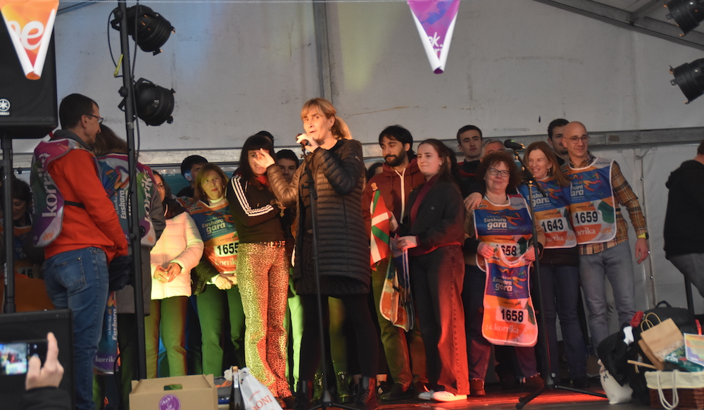 Banan bana igo dira oholtzara deitu ahala—bateren batek huts egin badu ere— eta igo bezala jaso dute petoa zegokien kilometro zenbakiarekin eta lekukoa. Eskuz esku pasa dute hori, euskararen sarea sendoa dela agerian jarrita. Gainera, eragile bakoitzak opari bat eraman behar izan du; horiek ondoren egin duten bingo musikatuan zozkatu dituzte, eta ondoren, DJ jotatxok jarriko ditu dantzan guztiak.