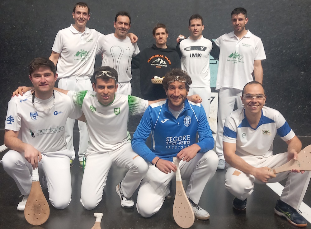 Zutik, Aldalur, Zubillaga, Aitzol epailea, Iriarte eta Garbisu. Makurtuta, Mitxelena, Salaberria, Dorrontsoro eta GartziandiaGirizia Giriziaren Euskal Herriko pala txapelketa irekiarekin jarraituz, iragan asteburuan beste hamaika partida jokatu zituzten Madalensoron, eta, tartea, bi Oarsoaldeko bi bikote lehiatu ziren.