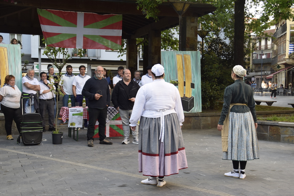 Horiek azalduta bertso parea eskaini zien Julen Olaizola bertsolari gazteak, bi omenduei bana, eta agurra dantzatu zieten. Horiek eginda, txotxa, botilatik eta Egiluzeko sagardoarekin, eta Foru Plazatik Arramendira abiatu ziren Oreretako Sagardo Egunaren sagastian bi sagarrondo landatzeko aurtengo bi gune omenduen izenean.