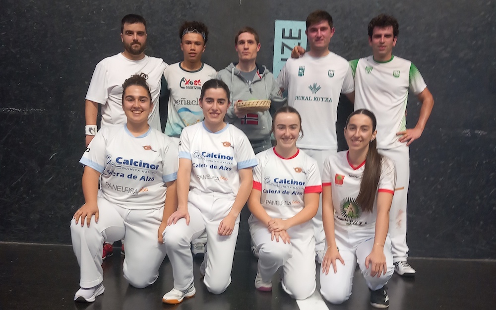 Zutik: Bela, Ezkerro, Aitzol (epailea), Mitxelena eta Salaberria. Makurtuta: Agirre, Murua, Luluaga eta Tejeria Pasa den asteburuan Giriziak antolatzen duen Euskal Herriko pala txapelketa irekiko bederatzi partida jokatu dituzte Oiartzunen, eta lau bikote oiartzuar lehiatu ziren. Bada, gainera, lau bikote horietatik hiruk irabazi zituzten partidak, eta beraz, hirugarren mailako hurrengo fasera pasa dira.