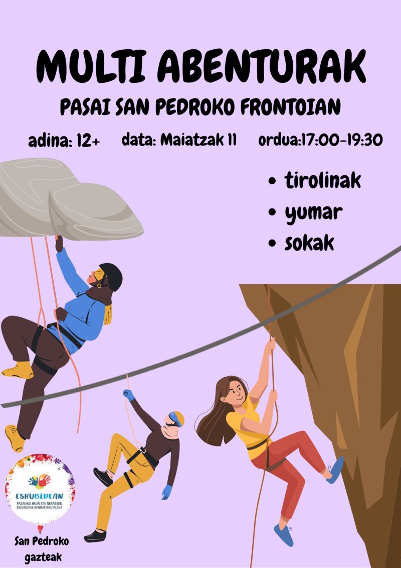 San Pedroko gazteek 12 urtetik gorako gazteei begirako Multi Abenturak izeneko jarduera antolatu dute maiatzaren 11rako. Parte hartzaileak San Pedroko frontoian elkartuko dira, 17:00etan, eta tirolinak, yumarrak eta sokak bezalako jarduerak probatu ahal izango dituzte.