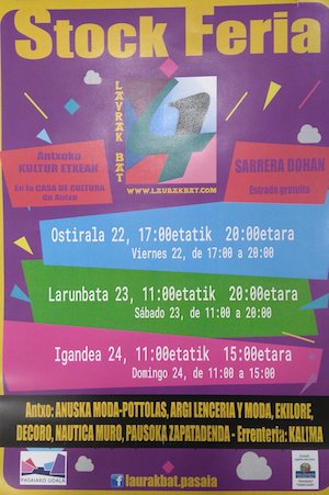 Ostiraletik igandera bitartean stock azoka kultur etxean. Ostiralean 17:00etik 20:00etara, larunbatean 11:00etatik20:00etara eta igandean 11:00etatik 15:00etara. Sarrera doan.