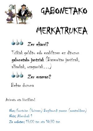 Gabonetako merkatrukea: baserritar jantziak, abarkak eta bestelako osagaia elkartrukatzeko azoka. 13:00eta, frontoian eta 18:30ean Begihandi tabernaren parean.