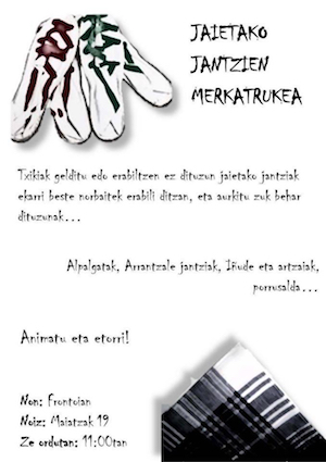 Jaietako jantziak trukatzeko Merkatrukea azoka. Txikiak geratu direnak eraman eta norberarentzako egokiagoak topatzeko aukera… Alpargatak, arrantzale jantziak, Iñude eta artzainen konpartsetakoak, Porruslada txaranagrenak…