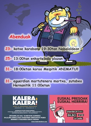 Gabonetan presoen aldeko hainbat mobilizazio antolatu dituzte datozen egunotan. Gaur kotxe karabana abiatuko da Nabalaldeatik 19:30ean; hilak 25ean, 13:00etan kartelada egingo dute plazan; hilaren 31n, eguerdian Martuteneko espetxera martxa eta 18:00etan, kopla zaharrak, Meipitik.