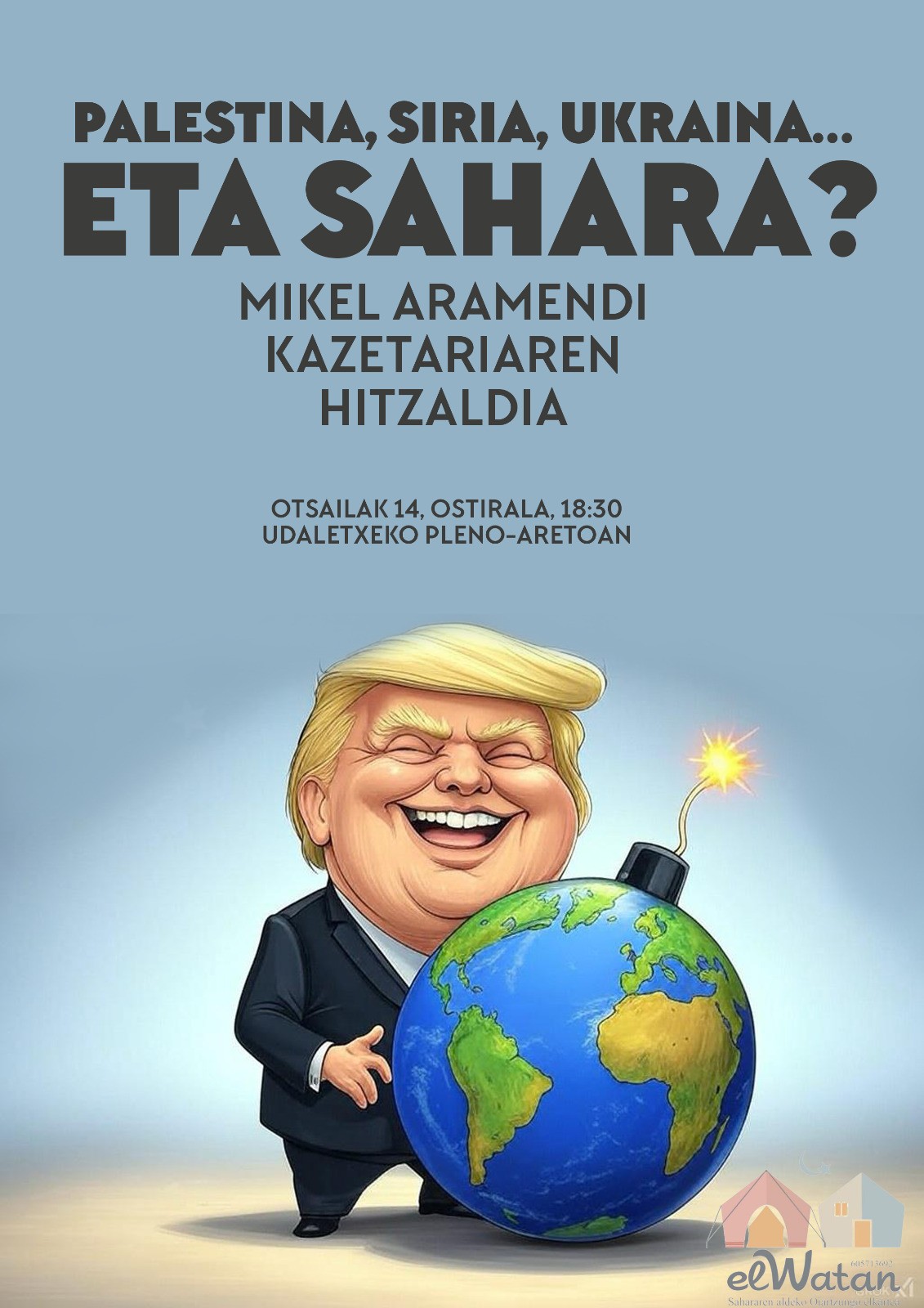 “Azken hamarkadetako garai desegonkorrena bizi dugu nazioartean: Ukrainiako gerra, etengabeko tentsioa Hego Txinako Itsasoan, Israel Palestinan egiten ari den txikizioa, Sirian gertatu berri den botere-aldaketa, etab. Testuinguru horretan, Maroko Mendebaldeko Saharaz erabat jabetzetik gertuago dago. Trump super aberatsen eskutik Etxe Zurira itzuli da, gatazka guzti horietan eragiteko eta “ABEn bakea” inposatzeko prest”, diote antolatzaileek. Aramendik gatazka guzti horien nondik norakoak azalduko ditu.