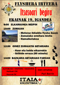 Zumaiako flyscha ezagutzeko irteera antolatu du Itaia Kolektiboak, Itsasora begira egitasmoaren barruan. 09:00etan elkartuko dira Meipin Zumaiara joateko. Han, txalupaz egingo dute txangoa, flyscha itsasotik ikusteko. Ondoren, Zumaiatik Getariara oinez joango dira, eta bazkaria Getariako farolan egingo dute. Izen-ematea, Pari Berrin.