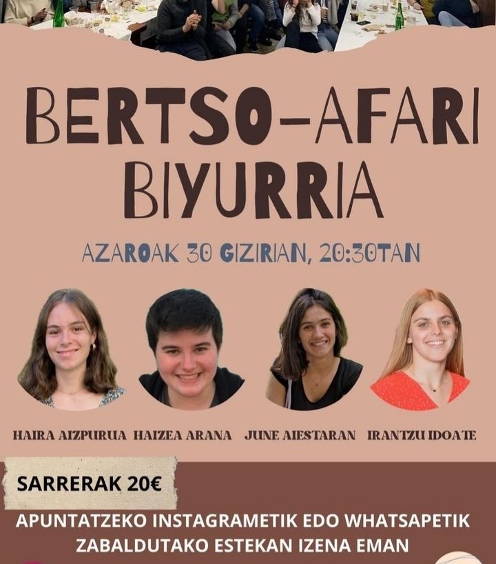 Bertso afari biyurria egingo dute Oiartzunen hilaren 30ean, Girizian. Haira Aizpurua, Haizea Arana, June Aiestaran eta Irantzu Idoate izango dira bertsolaria, eta sarrerak 20 euro balio du.