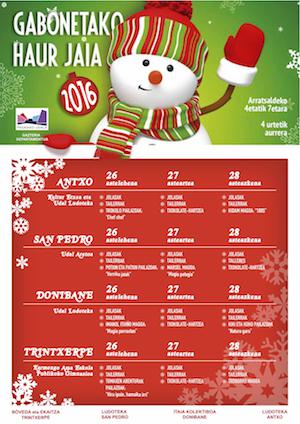 Gabonetako Hau Jaiaren barruan, arratsaldera, 16:00etatik 19:00etara, jolasak, tailerrak eta pailazoen nahiz magoen ikuskizuna, 4 urtetik gorako haurrentzat, doan.