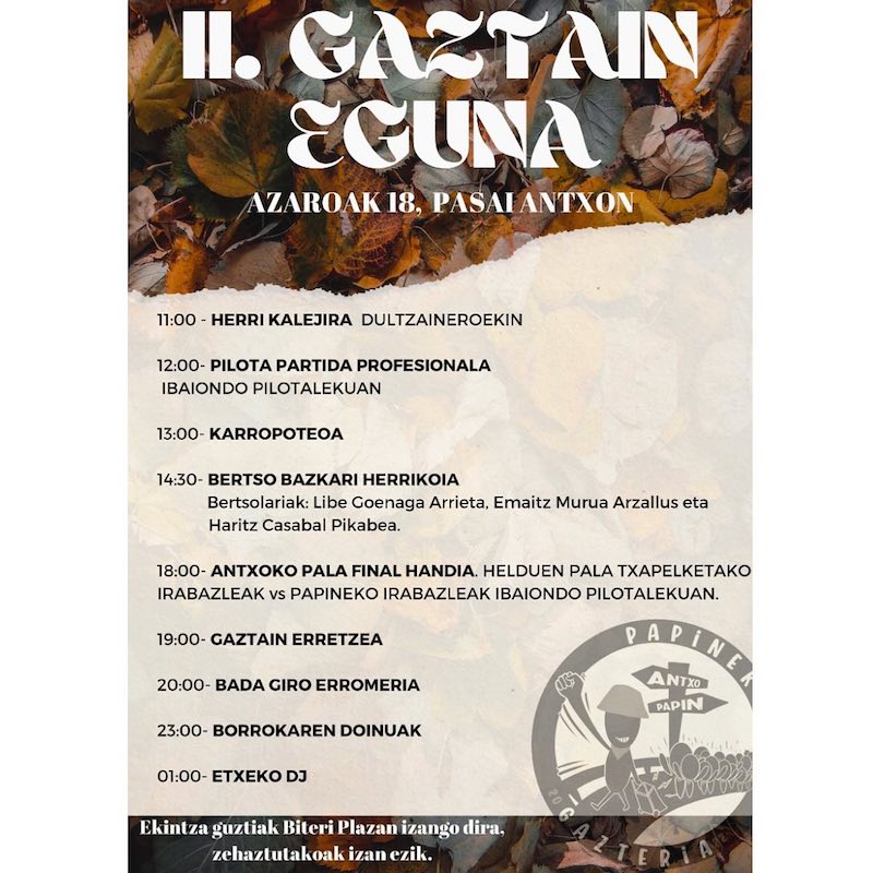 Azaroaren 18an gaztaina usainak Pasai Antxo hartuko du, Gaztain Eguna antolatu baitu Papineko Gazteriak. Antxotarrek eguna jai giroan ospatuko dute, eta egun osoko programazioa ondu dute. Jarduera gehienak Biteri plazan izango dira.