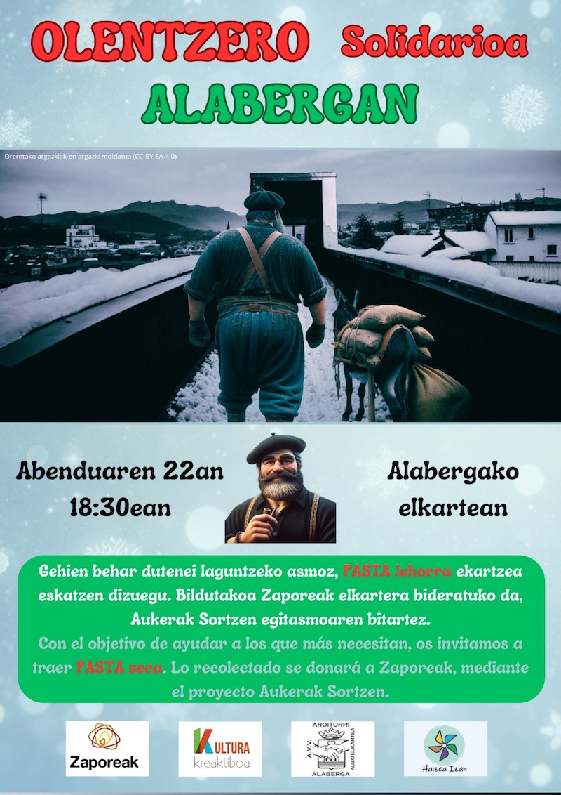 Alabergako Arditurri Auzo Elkarteak Alabergako Olentzero solidarioa antolatu du abenduaren 22rako. Beharra dutenei laguntzeko helburuarekin, auzo elkarteko kideek pasta lehorra jasoko dute Alabergako elkartean, 18:30etik aurrera. Bildutako jakiak Zaporeak elkarteari igorriko dizkiote.