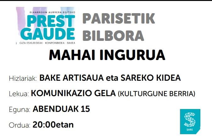 Mahai ingurua ‘Paristik Bilbora’ lelopean. Frantziako kartzeletatik biran egon de Sareko kide batek parte hartuko du eta bake artisauen esperientzia plazaratuko dute. Antolatzailea: Donibaneko Sare.